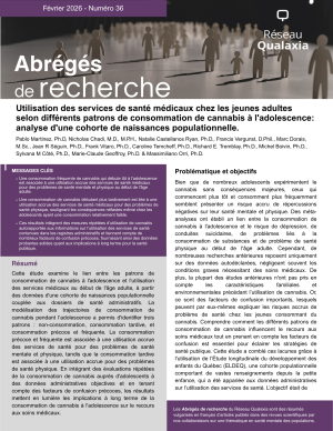 Cette étude examine le lien entre les patrons de consommation de cannabis à l'adolescence et l'utilisation des services médicaux au début de l'âge adulte, à partir des données d'une cohorte de naissances populationnelle couplée aux dossiers de santé administratifs.