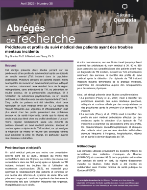 Cet abrégé présente deux études portant sur les prédicteurs et les profils du suivi médical après un épisode de trouble mental (TM) incident dans la population québécoise.