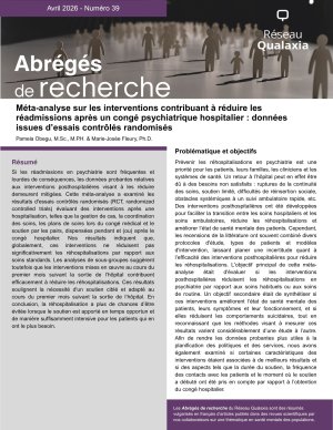 Si les réadmissions en psychiatrie sont fréquentes et lourdes de conséquences, les données probantes relatives aux interventions posthospitalières visant à les réduire demeurent mitigées. Cette méta-analyse a examiné les résultats d'essais contrôlés randomisés (RCT, randomized controlled trials) évaluant des interventions après une hospitalisation, telles que la gestion de cas, la coordination des soins, les plans de soins lors du congé médical et le soutien par les pairs, dispensées pendant et (ou) après le congé hospitalier.
