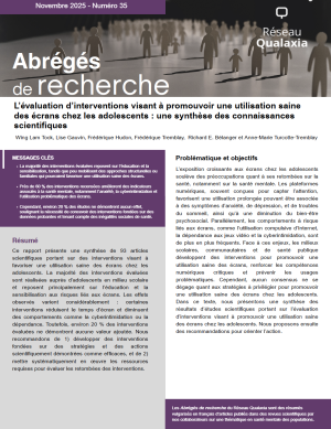 Ce rapport présente une synthèse de 93 articles scientifiques portant sur des interventions visant à favoriser une utilisation saine des écrans chez les adolescents. La majorité des interventions évaluées sont réalisées auprès d’adolescents en milieu scolaire et reposent principalement sur l’éducation et la sensibilisation aux risques liés aux écrans.