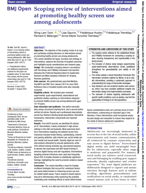 L’objectif de cette revue de portée est de cartographier et de synthétiser la littérature existante sur les interventions visant à promouvoir un usage sain des écrans chez les adolescents. Elle identifie les types, fonctions et contextes des interventions, explore la diversité des résultats ciblés et met en évidence les enjeux d’équité ainsi que les lacunes de la recherche.