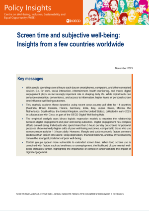 À mesure que les technologies numériques prennent une place centrale dans la vie quotidienne, le temps passé devant les écrans façonne de plus en plus l’expérience du bien-être. Cette note de synthèse examine ces dynamiques à partir de données récentes issues d’un sondage international mené dans 14 pays, recueillies au début de l’année 2025 en collaboration avec Cisco, dans le cadre de OECD Digital Well-being Hub.