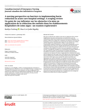 Furlong, K., Li H. et Bigalky, J. (2025). Un point de vue infirmier sur les obstacles à la mise en application de la réduction des méfaits dans les établissements hospitaliers de soins aigus : un examen exploratoire. Journal canadien des infirmières d’urgence. 48(1), 48-53. https://doi.org/10.29173/cjen240
