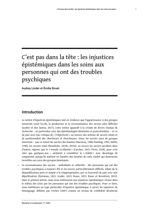Linder. A., Bovet, E. (2024). C’est pas dans la tête : les injustices épistémiques dans les soins aux personnes qui ont des troubles psychiques. Éducation et socialisation, 71. https://doi.org/10.4000/edso.27115
