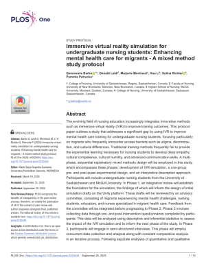 Barbo, G., Leidl, D., Montreuil, M., Li, H., Richter, S., Petrucka, P. (2025). Immersive virtual reality simulation for undergraduate nursing students: Enhancing mental health care for migrants - A mixed method study protocol. PLOS One. 20(9). https://doi.org/10.1371/journal.pone.0333434