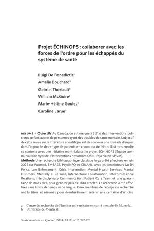 De Benedictis, L., Bouchard, A., Thériault, G., McGuire, W., Goulet, M.-H. & Larue, C. (2024). Projet ÉCHINOPS : collaborer avec les forces de l’ordre pour les échappés du système de santé. Santé mentale au Québec, 49(2), 247–270. https://doi.org/10.7202/1114413ar