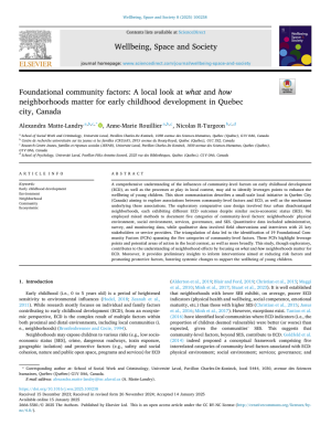 Matte-Landry, A., Rouillier, A-M. & R-Turgeon N. (2025). Foundational community factors: A local look at what and how neighborhoods matter for early childhood development in Quebec city, Canada. Wellbeing, Space and Society, 8. https://doi.org/10.1016/j.wss.2025.100238