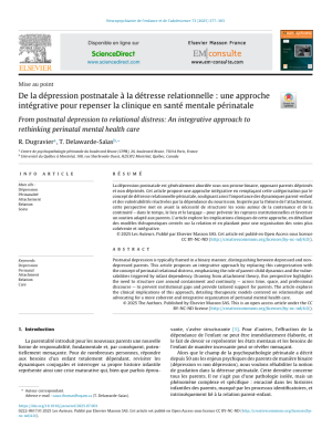 Dugravier, R. & Delawarde-Saïas. T. (2025). De la dépression postnatale à la détresse relationnelle : une approche intégrative pour repenser la clinique en santé mentale périnatale. Neuropsychiatrie de l'Enfance et de l'Adolescence. 73(7), 377-383. https://doi.org/10.1016/j.neurenf.2025.07.001