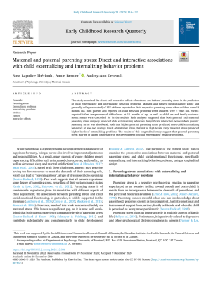 Lapolice Thériault, R., Bernier, A., Deneault, A-A. (2025). Maternal and paternal parenting stress: Direct and interactive associations with child externalizing and internalizing behavior problems. Early Childhood Research Quarterly. 71, 114-122. https://doi.org/10.1016/j.ecresq.2024.12.006.