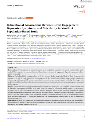 Sciola, A., Acland, E., Philippe, FL., Loose, T., Orri, M., Vergunst, F., Ouellet-Morin, I., Castellanos-Ryan, N., Girard, A., Talwar, V., Côté, S. et Geoffroy, MC. (2025). Bidirectional associations between civic engagement, depressive symptoms, and suicidality in youth: A population-based study. Journal of Adolescence, n/a(n/a). 1-13. https://doi.org/10.1002/jad.70029