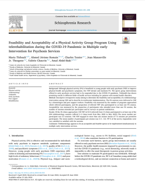 Thibault, M., Romain, A. J., Tessier, C., Theagene, J. M. J., Chauvin, V., & Abdel-Baki, A. (2024). Feasibility and Acceptability of a Physical Activity Group Program Using telerehabilitation during the COVID-19 Pandemic in Multiple early Intervention for Psychosis Services. Schizophrenia research, 270, 451–458. https://doi.org/10.1016/j.schres.2024.06.053